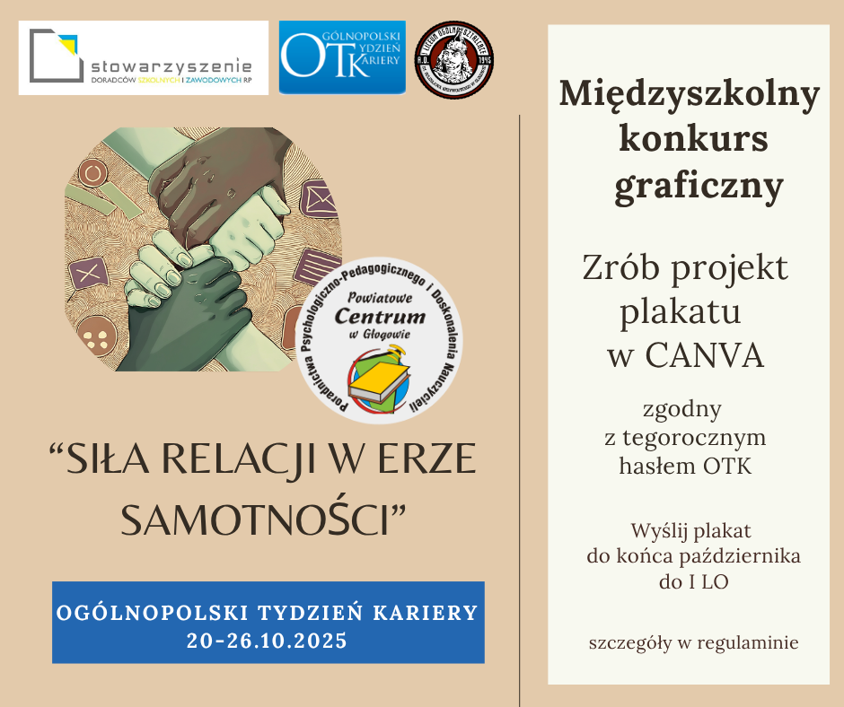 Z okazji obchodów Ogólnopolskiego Tygodnia Kariery (20-26.10.2025) członkinie Sieci Współpracy i Samokształcenia Nauczycieli doradztwa zawodowego przy PCPPPiDN w Głogowie zapraszają uczniów do wzięcia udziału w: – międzyszkolnej grze edukacyjnej (20-23.10.2025) – finale rozgrywek międzyszkolnych gry edukacyjnej w PANS (24.10.2025 godz. 9.00) – międzyszkolnym konkursie graficznym (wysyłanie plakatów do I LO do końca października) – webinarze… Czytaj wiecej →