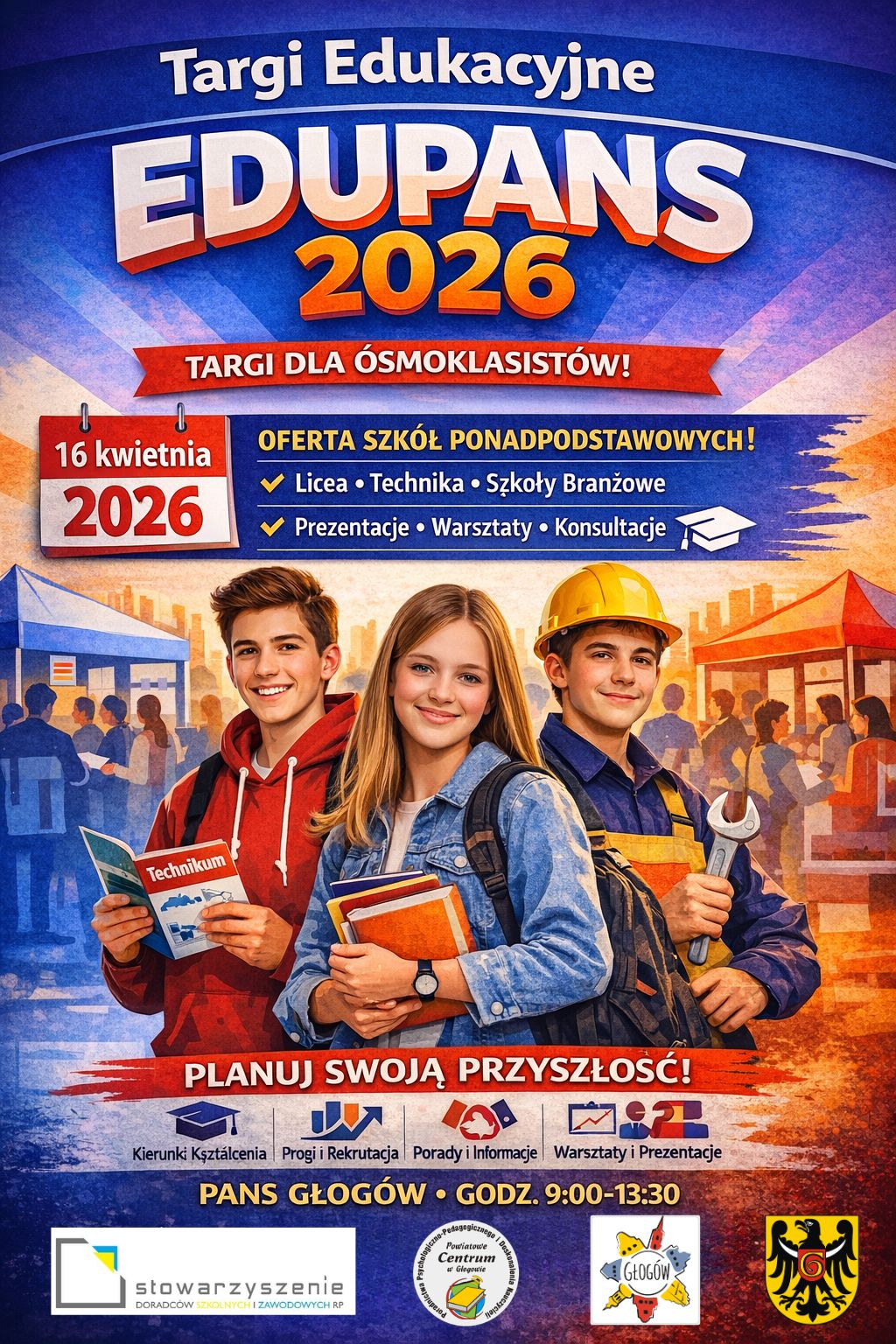 Zapraszamy uczniów klas ósmych do zapoznania się z ofertą edukacyjną szkół ponadpodstawowych powiatu głogowskiego. Obecność uczniów na targach edukacyjnych EDUPANS w dniu 16.04.2026r. umożliwi im bezpośredni kontakt z przedstawicielami szkół ponadpodstawowych, przyjrzenie się profilom nauczania i związanymi z nimi umiejętnościami, a także zapoznanie z Informatorem Edukacyjnym Powiatu Głogowskiego. Pozwoli także na udział w zadaniach i… Czytaj wiecej →