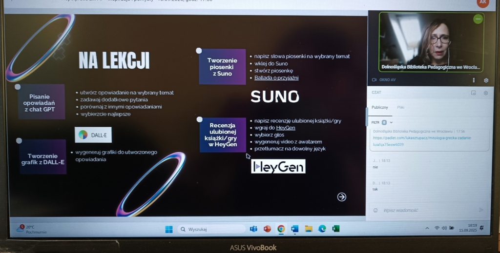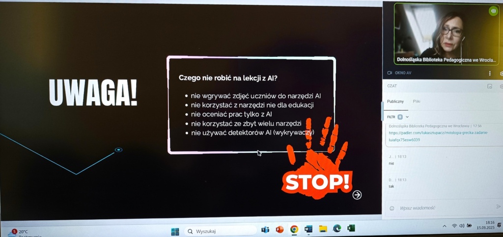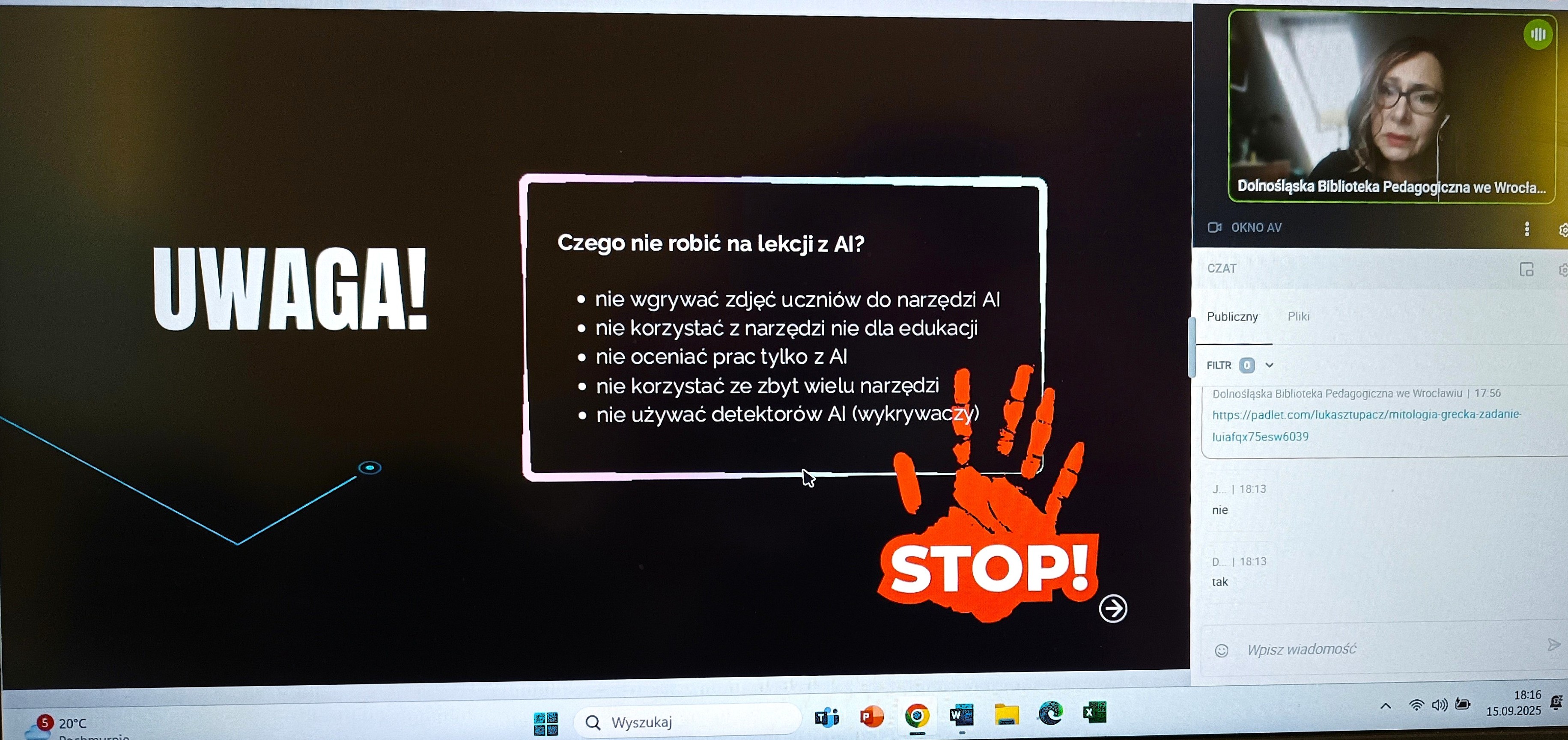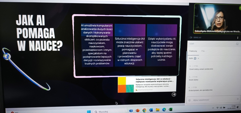 15 września 2025 roku odbyło się szkolenie online pt. „Współpraca z AI – edukacyjne inspiracje i pomysły”, prowadzone przez Beatę Malentowicz z Dolnośląskiej Biblioteki Pedagogicznej we Wrocławiu. W wydarzeniu uczestniczyli nauczyciele z powiatów głogowskiego, polkowickiego i zgorzeleckiego.