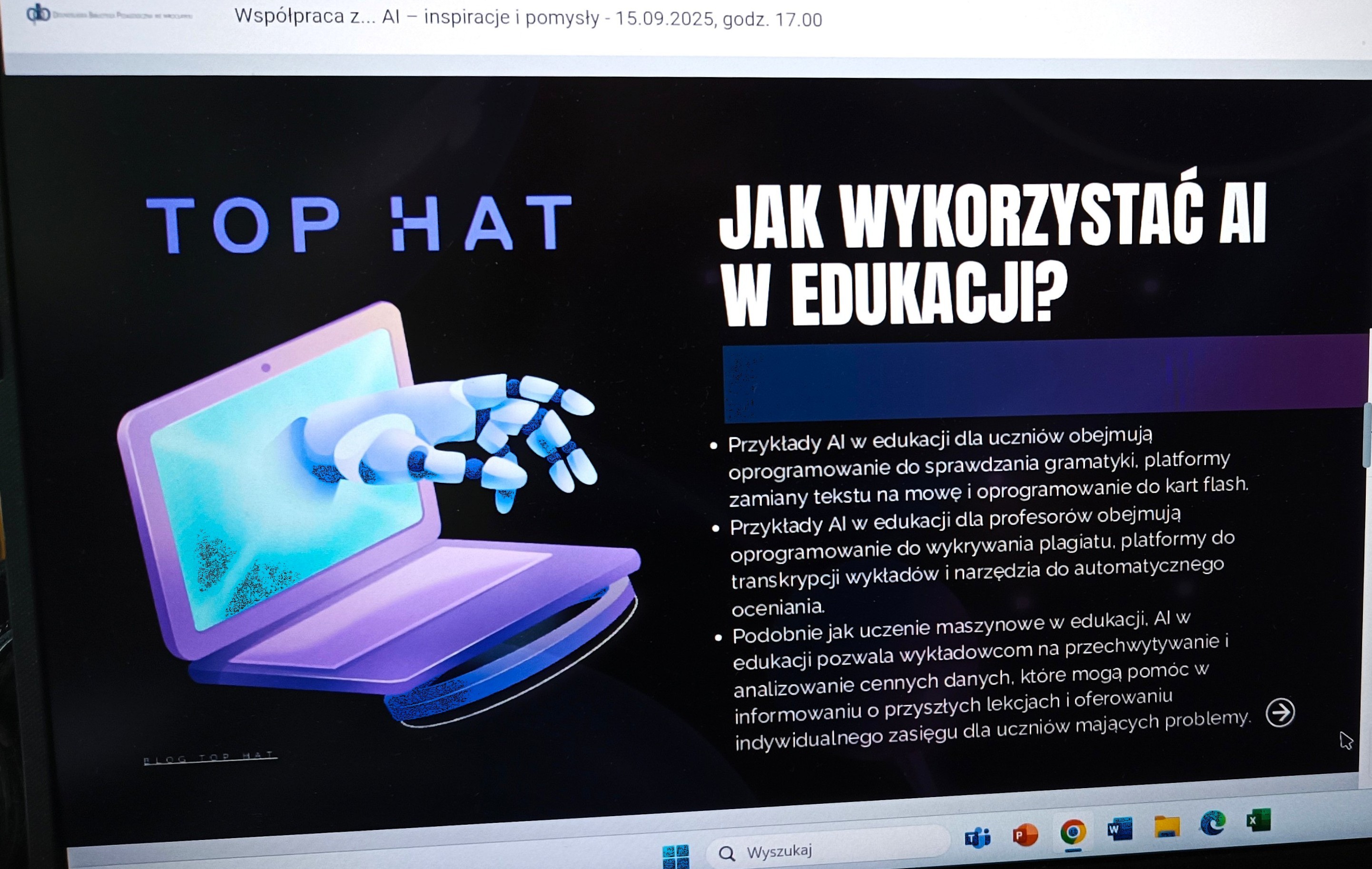 Podczas spotkania omówiono praktyczne zastosowania sztucznej inteligencji w edukacji oraz zaprezentowano narzędzia wspierające pracę nauczycieli, takie jak ChatGPT, Copilot, Canva Magic Studio czy Adobe Firefly. Uczestnicy poznali możliwości wykorzystania AI w planowaniu zajęć, tworzeniu materiałów dydaktycznych, generowaniu grafik i analizie danych edukacyjnych. Poruszono również temat szans i zagrożeń wynikających z rozwoju nowych technologii w szkole.