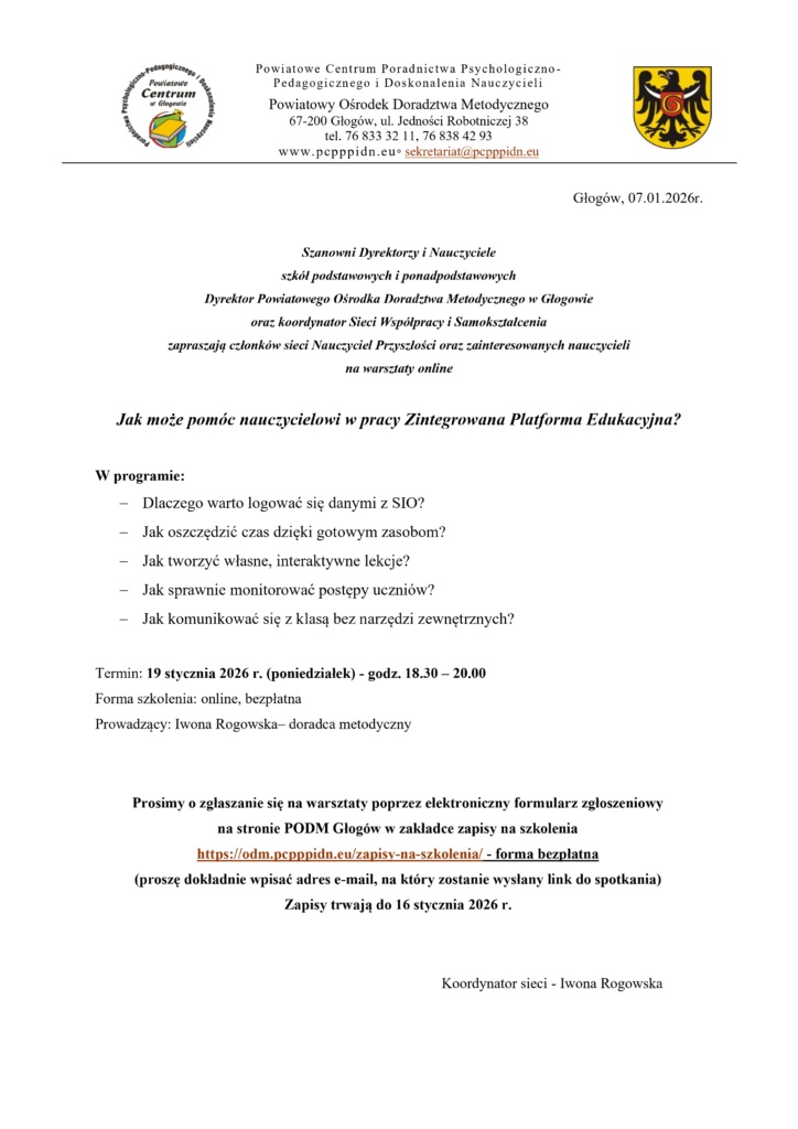 Warsztaty online w ramach sieci współpracy i samokształcenia NAUCZYCIEL PRZYSZŁOŚCI pt. „Jak może pomóc nauczycielowi w pracy Zintegrowana Platforma Edukacyjna?” 19.01.2026 r. ZAPRASZAMY Napisany w 9 stycznia 2026 Przez pcpppidn