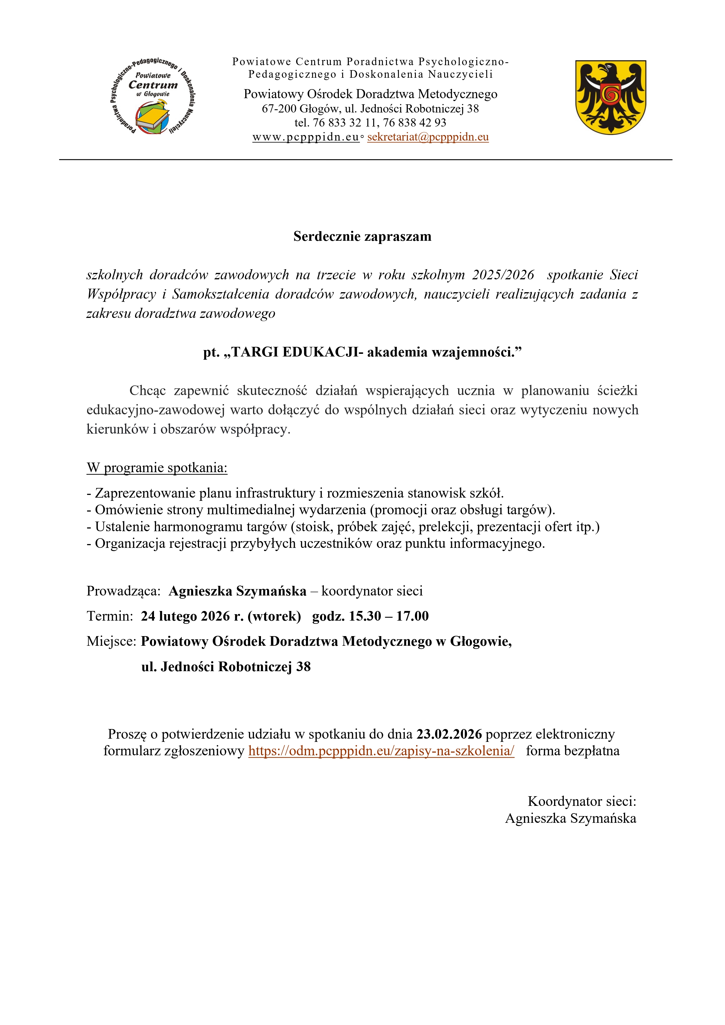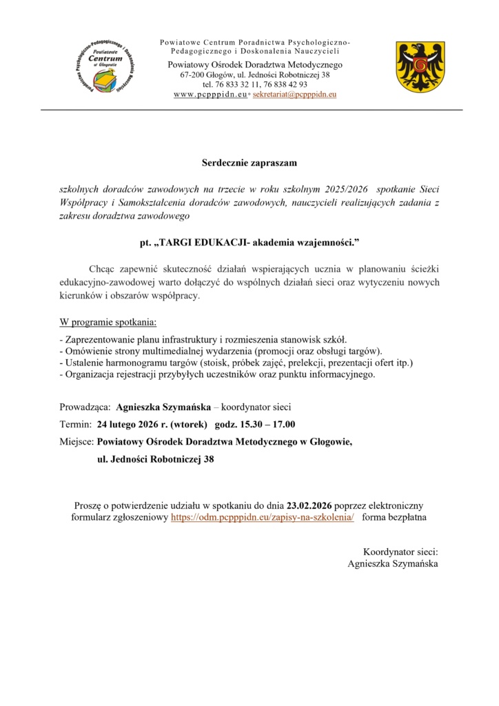 ZAPRASZAMY szkolnych doradców zawodowych na spotkanie w ramach Sieci Współpracy i Samokształcenia „TARGI EDUKACJI – akademia wzajemności”
