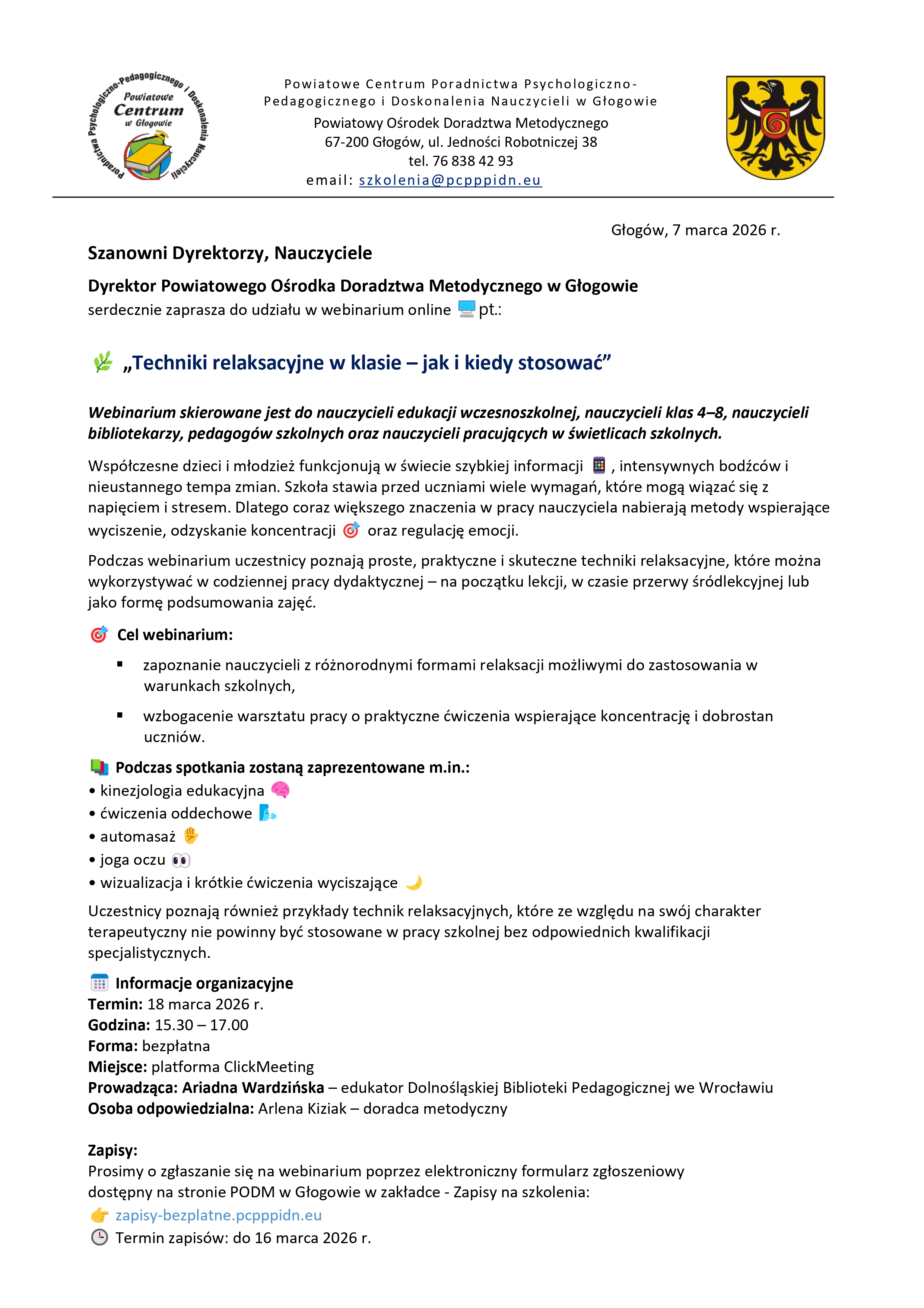 Webinarium online pt.: Techniki relaksacyjne w klasie – jak i kiedy stosować Napisany w 9 marca 2026 Przez pcpppidn