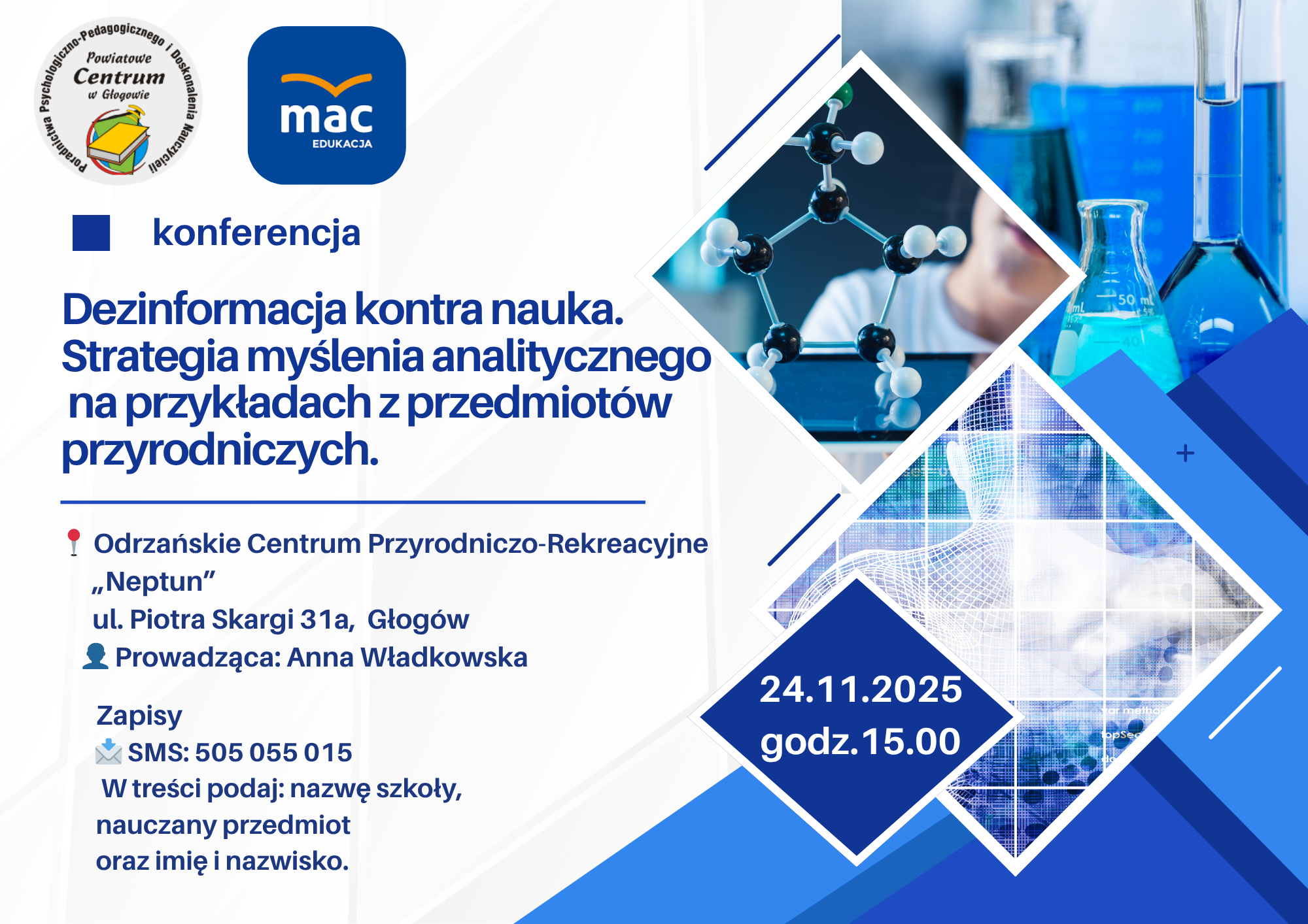 Wydawnictwo MAC Edukacja oraz Powiatowy Ośrodek Doradztwa Metodycznego w Głogowie serdecznie zapraszają nauczycieli przedmiotów przyrodniczych oraz wszystkich zainteresowanych rzetelną edukacją na konferencję stacjonarną: 📅 24 listopada 2025 🕒 Godz. 15.00 – 17.00 📍 Odrzańskie Centrum Przyrodniczo-Rekreacyjne „Neptun” ul. Piotra Skargi 31A, 67-200 Głogów 👤 Prowadząca: Anna Władkowska Dlaczego warto? • Dowiesz się, jak rozwijać u… Czytaj wiecej →