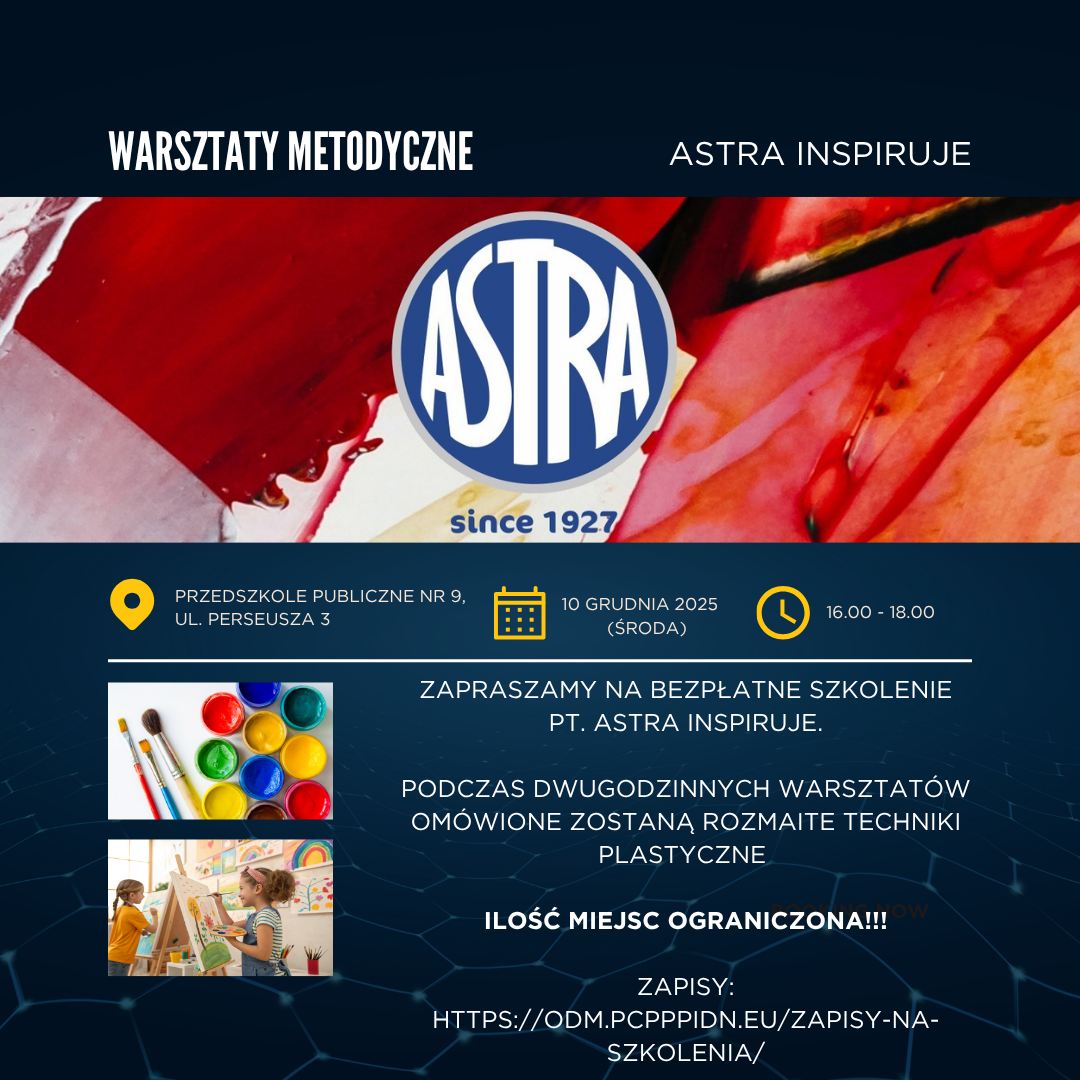 | 1 | Warsztaty dla nauczycieli przedszkoli pt.”ASTRA INSPIRUJE” (LISTA ZAMKNIĘTA – brak miejsc) | 10 grudnia |